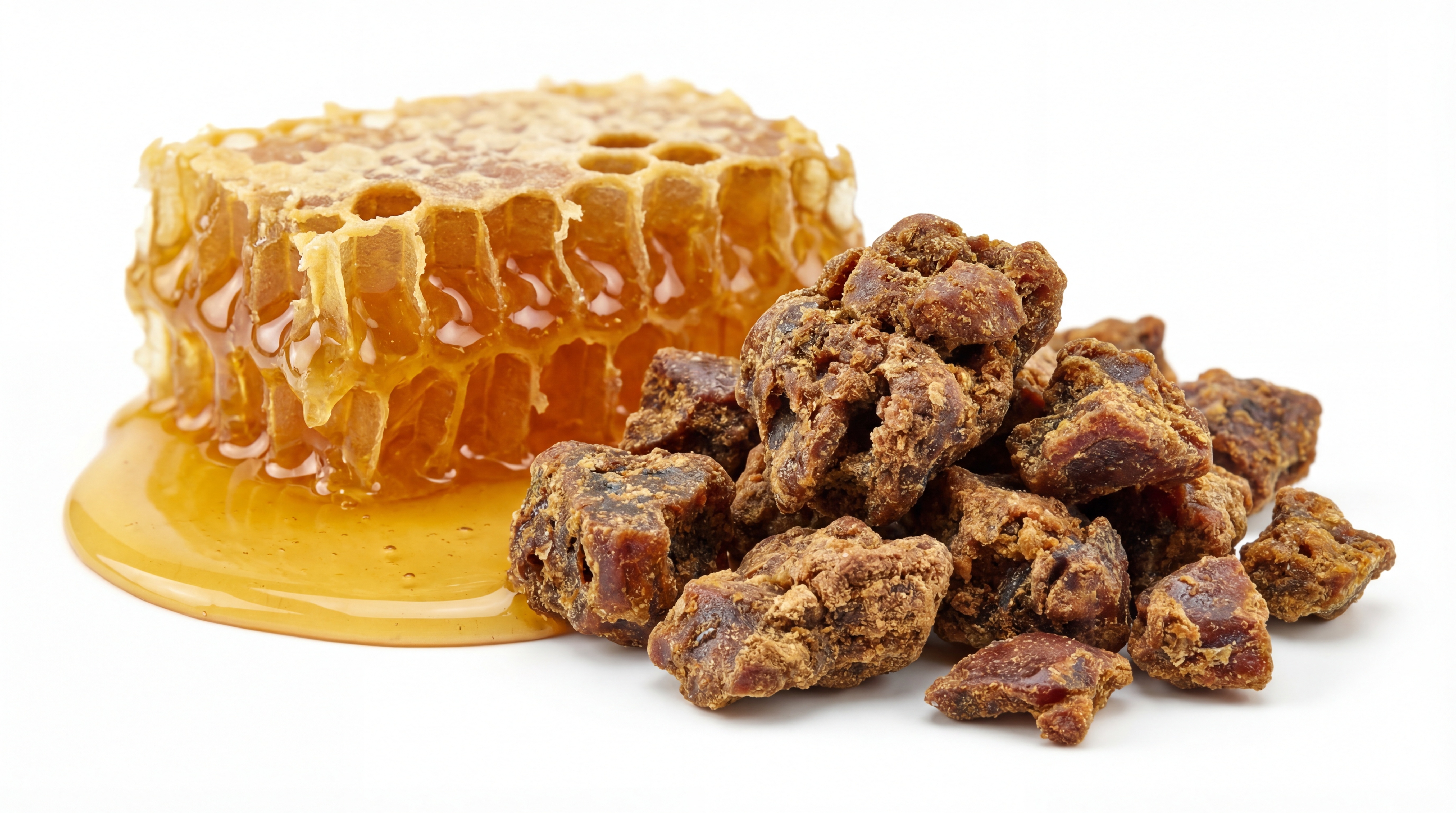 Propolis, auch Kittharz genannt, ist ein von Honigbienen hergestelltes Schutzharz. Der Entstehungsprozess umfasst das Sammeln natürlicher Rohstoffe und deren anschließende Veredelung im Bienenstock.